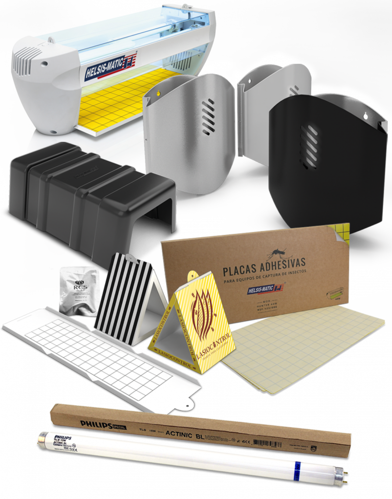Modelos para captura de insectos voladores mediante placas adhesivas. Los insectos son atraídos por la luz UltraVioleta y quedan capturados de manera higiénica y silenciosa en las láminas adhesivas.